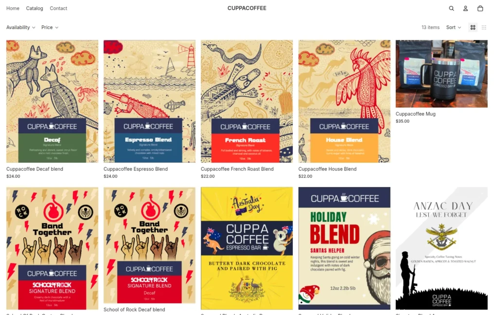 CUPPACOFFEE is an Australian coffee provider that celebrates local culture with a unique range of themed blends. Their signature offerings include distinctively Australian-named roasts such as the “Anzac,” “Billabong,” and “Sydney Sider” blends, alongside seasonal options like the Australia Day roast. They also cater to diverse tastes with classic Espresso, French Roast, and House blends, as well as Decaf options. Operating online, CUPPACOFFEE offers a convenient way for customers to explore these locally inspired coffee varieties.