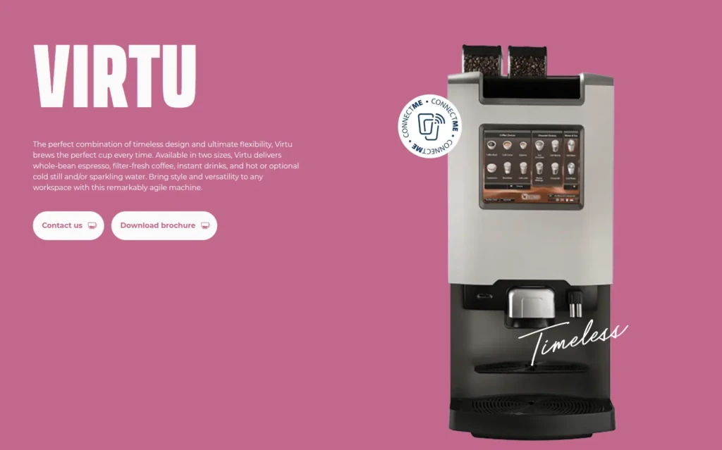 The Virtu from De Jong DUKE suits offices that want espresso, drip coffee, and even still or sparkling water from one appliance. The manufacturer describes Virtu as combining a timeless design with flexibility; it brews whole‑bean espresso, filter‑fresh coffee, instant drinks, and optional cold still or sparkling water. A 10.4-inch color touchscreen makes ordering simple, and the user can see whole beans through a clear panel, reminding everyone that the coffee is freshly ground. De Jong DUKE also offers a customizable front panel, so the machine can match a company’s colors or décor. Safety features include glass detection – the machine will not start until a cup is in place. Because it is connected to De Jong DUKE’s ConnectMe system, businesses can monitor usage remotely and schedule maintenance. The Virtu’s combination of fresh‑ground coffee, customization,and remote monitoring makes it a flexible choice for medium to large offices.