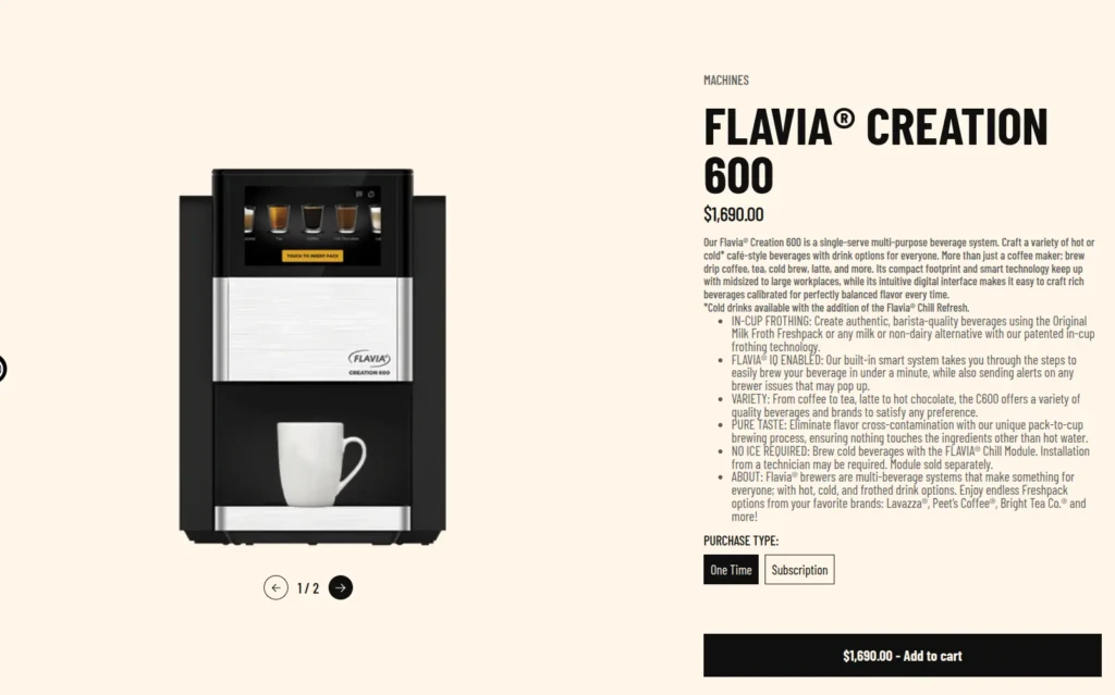 For offices that want to accommodate many tastes without a full espresso bar, the Flavia Creation 600(C600) is a practical option. Flavia describes the C600 as a single‑serve multi‑purpose beverage system that can craft a variety of drinks – drip coffee, tea, cold brew, lattes, and more. It uses sealed Freshpack pods, so flavors stay separate and there is no cross‑contamination. A Chill module can be added to brew cold beverages without needing ice, which makes it possible to offer cold brew coffee or fruit‑infused water. The built‑in FLAVIA IQ system guides users through brewing and even sends alerts if something goes wrong. The machine’s in‑cup frothing technology means that café‑style lattes and cappuccinos can be made using either dairy or plant‑based milks. Compact and easy to maintain, the C600 suits medium‑sized offices that want choice without the hassle of a large espresso machine.