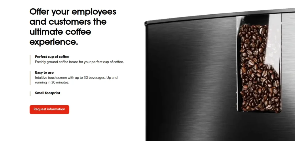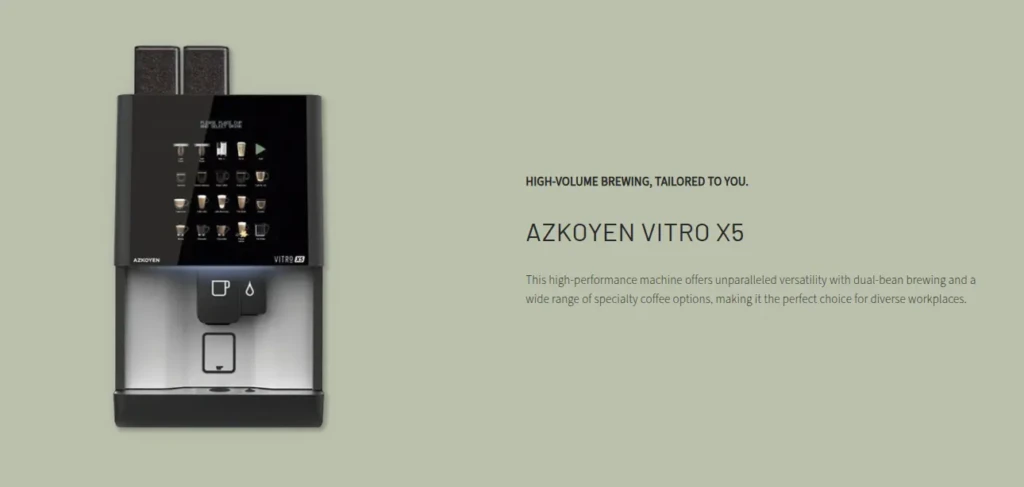 Large offices or public lobby areas need a machine that can keep up with demand. The Azkoyen Vitro X5 is built for high‑volume brewing and customization. The Coffee Corp, a US supplier of the machine, notes that the Vitro X5 has two bean hoppers and three containers for soluble products, so it can offer two different coffee varieties alongside milk powder or chocolate. The machine can brew both espresso and filter coffee, giving employees options. Up to twenty drink selections are available, and the user interacts through a touchless interface, which promotes hygiene. Because it holds enough beans and powder to produce about 220 coffee “cakes” (used grounds), it’s suitable for workplaces serving 250 cups or more each day. If your organization requires a robust machine that handles heavy traffic, the Vitro X5’s dual-beam system and touchless controls are attractive.