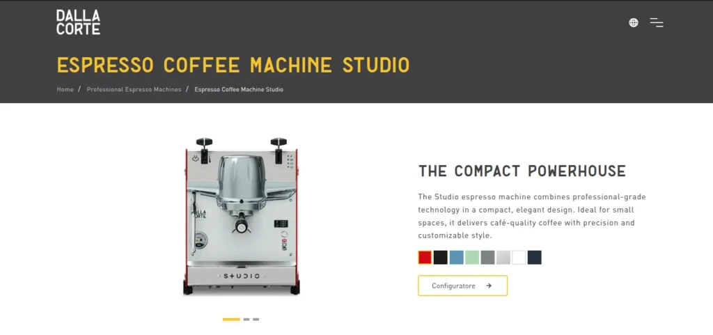 The Studio is a compact, professional-grade espresso machine designed by Italian company Dalla Corte. The official Dalla Corte page describes it as featuring independent brewing and steaming systems, enabled by multi-boiler technology. The machine can run on either a 4-litre water tank or be connected directly to plumbing, making it versatile for small cafés, offices, and catering setups. A digital display lets users easily adjust brew temperature, extraction time, and other parameters, while a professional steam wand and a 5.8 kg brass group ensure stability and strong steaming power. The Studio is available in various colors and uses energy-saving features to reduce power consumption.